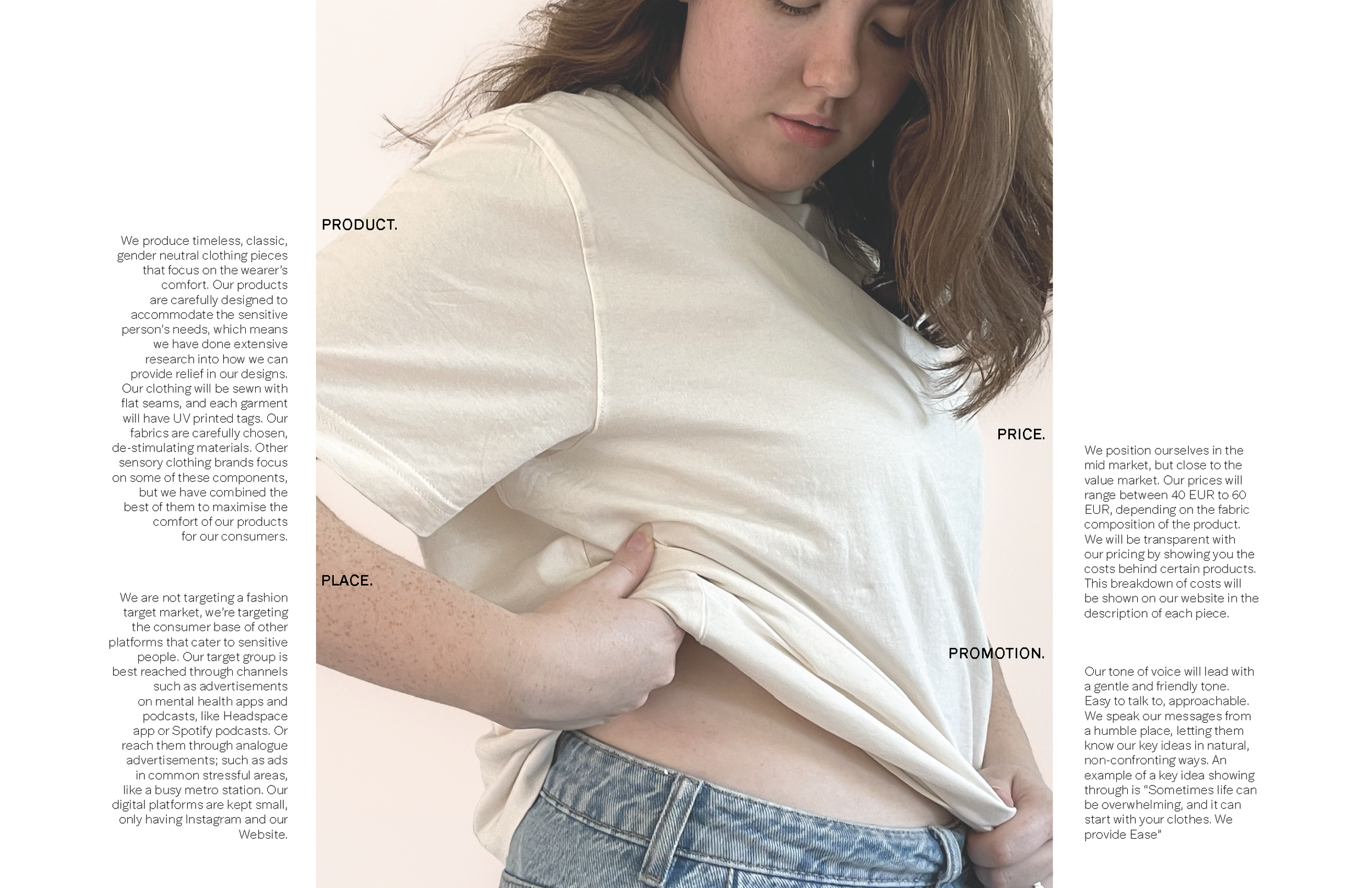 Ease is a concept for a comfort clothing brand created for touch-sensitive individuals. All clothing is made from high-quality, low-stimulus materials. The garment is constructed with flat seams, and the tags are UV printed into the fabric, providing the least amount of stimulation possible.